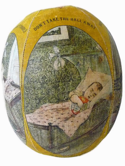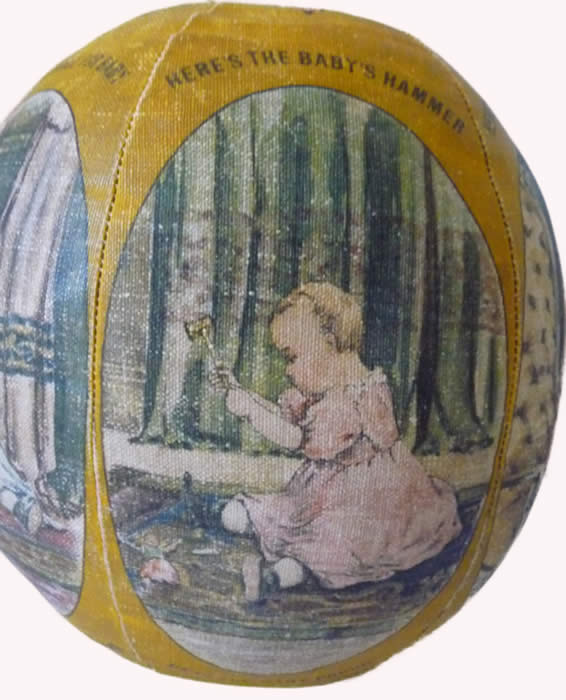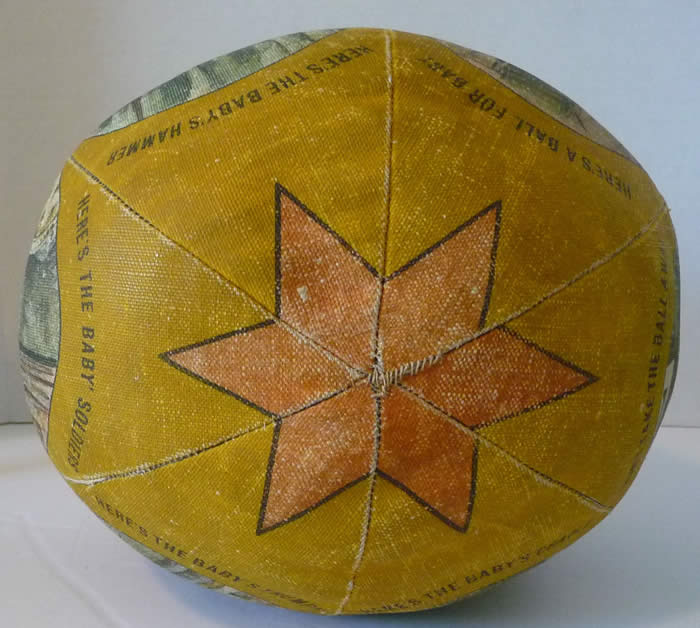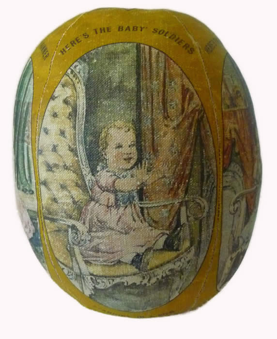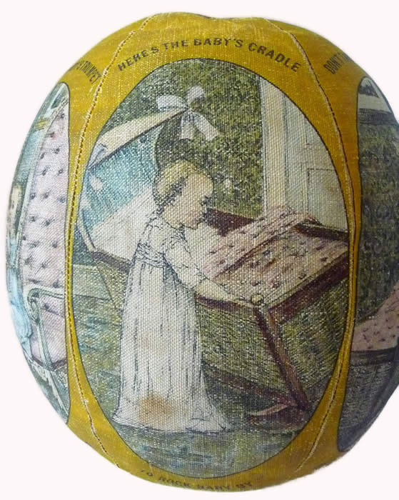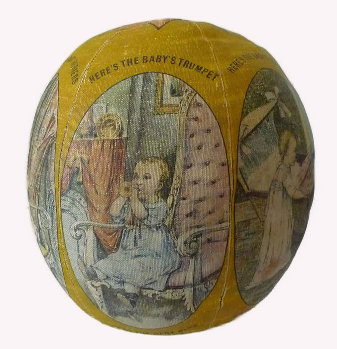 Stuffed textile ball with 6 lithographed illustrations from a nursery rhyme. Each wedge shaped segment of the ball is chromolithographed with scenes of a baby engaged in various activities typical of a Victorian child. Each illustration is accompanied by 2 descriptive lines of verse one above and one below. “Here’s a ball for baby/ nice and soft and round / here’s the baby’s hammer/hear the baby pound / here’s the baby’s soldiers/standing in a row / here’s the baby’s trumpet/hear the baby blow / don’t take the ball away/ to make baby cry / here’s the baby’s cradle/to rock baby by”