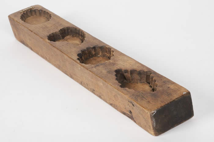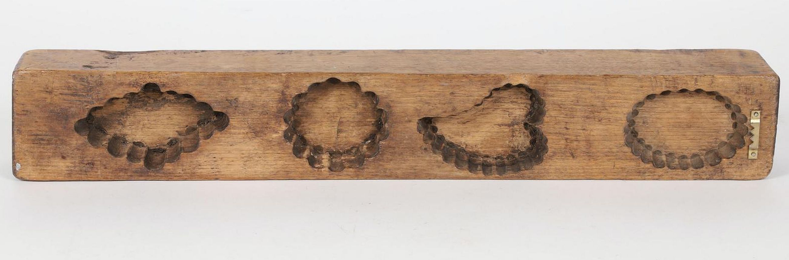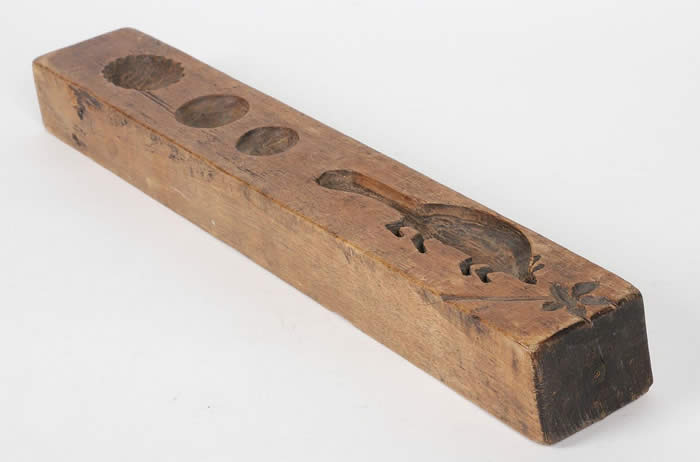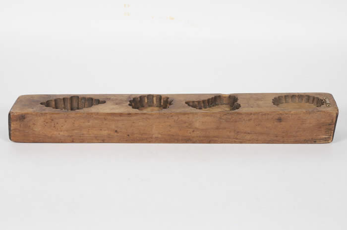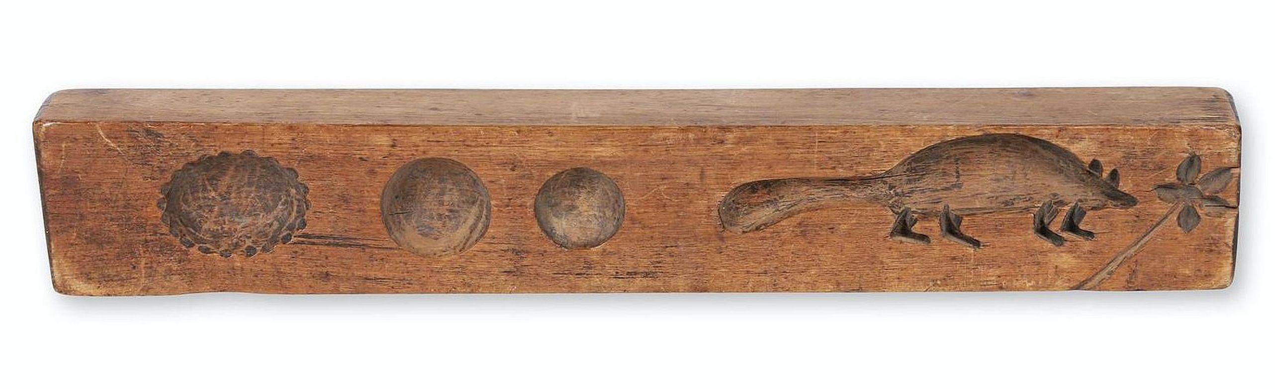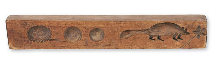 This double sided birch maple sugar mold has a deeply carved beaver image, an egg, two balls and a flower sprig on one side while the reverse has a heart, diamond, oval and circle all with ridged sides. Quebec, 19th century.