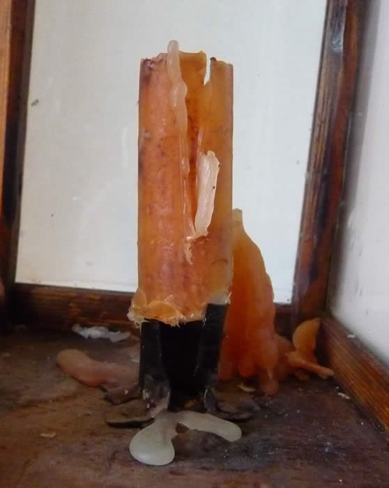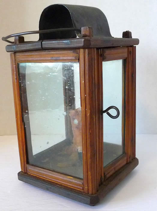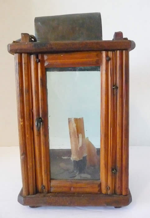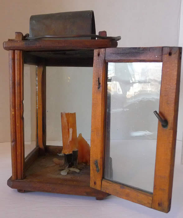 This wooden candle lantern, late 18th early 19th century, , has 4 glass sides one of which is a door that opens to light the candle. Note the chamfered corner posts, base and top