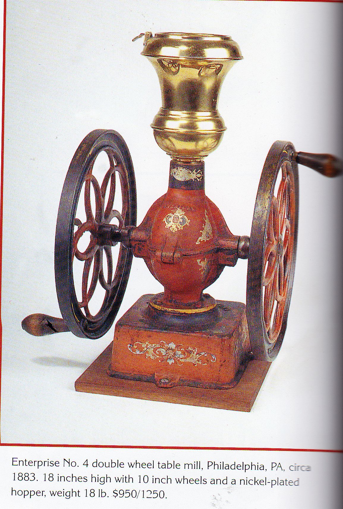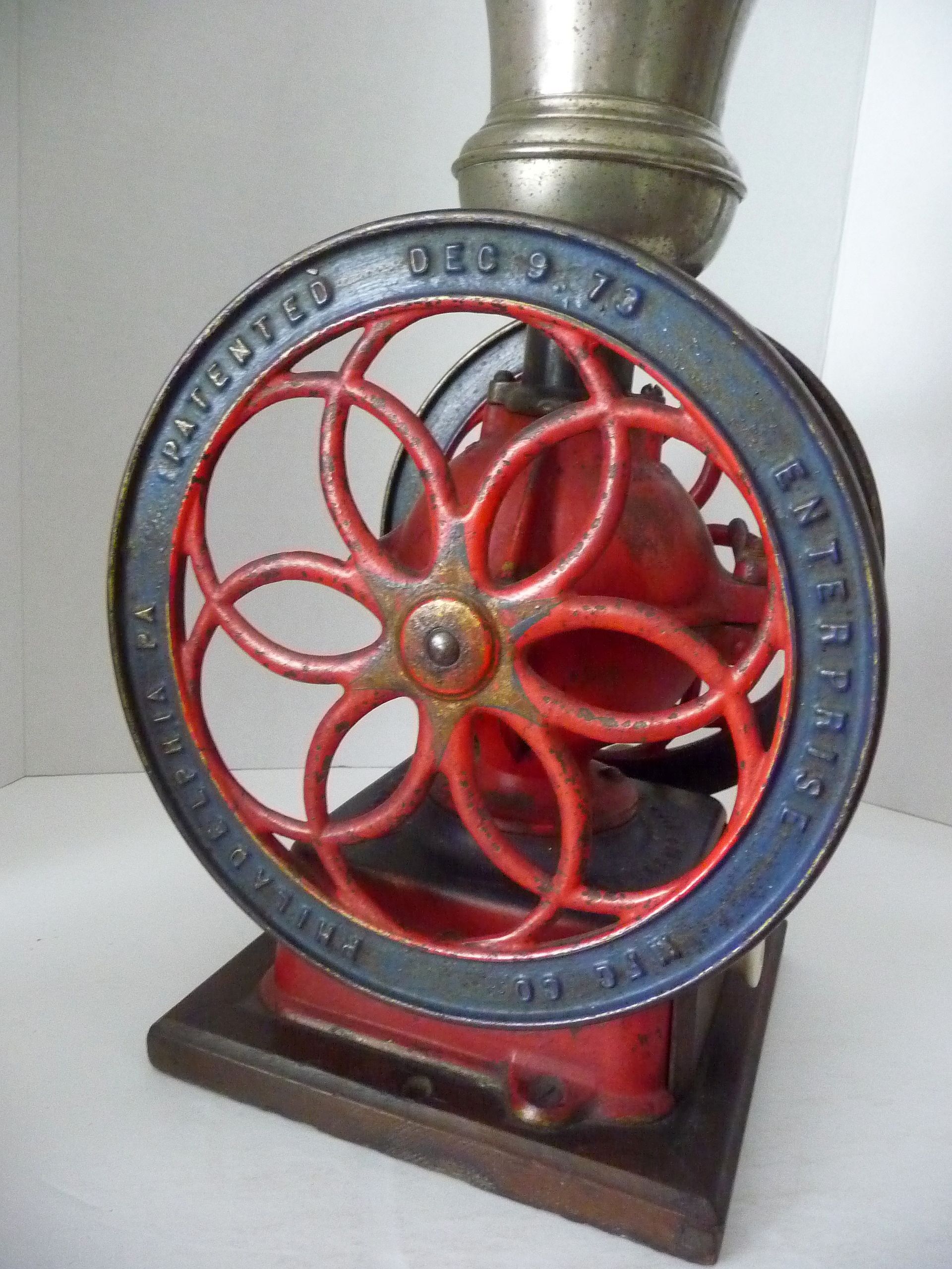 Painted cast iron Enterprise Mfg Co Philadelphia PA #4 coffee mill. Stamped "AMERICAN" and Patented Oct. 21 1871 (under the hopper) and Dec.9 1873 (on the wheel). See photos. Wooden drawer marked #4