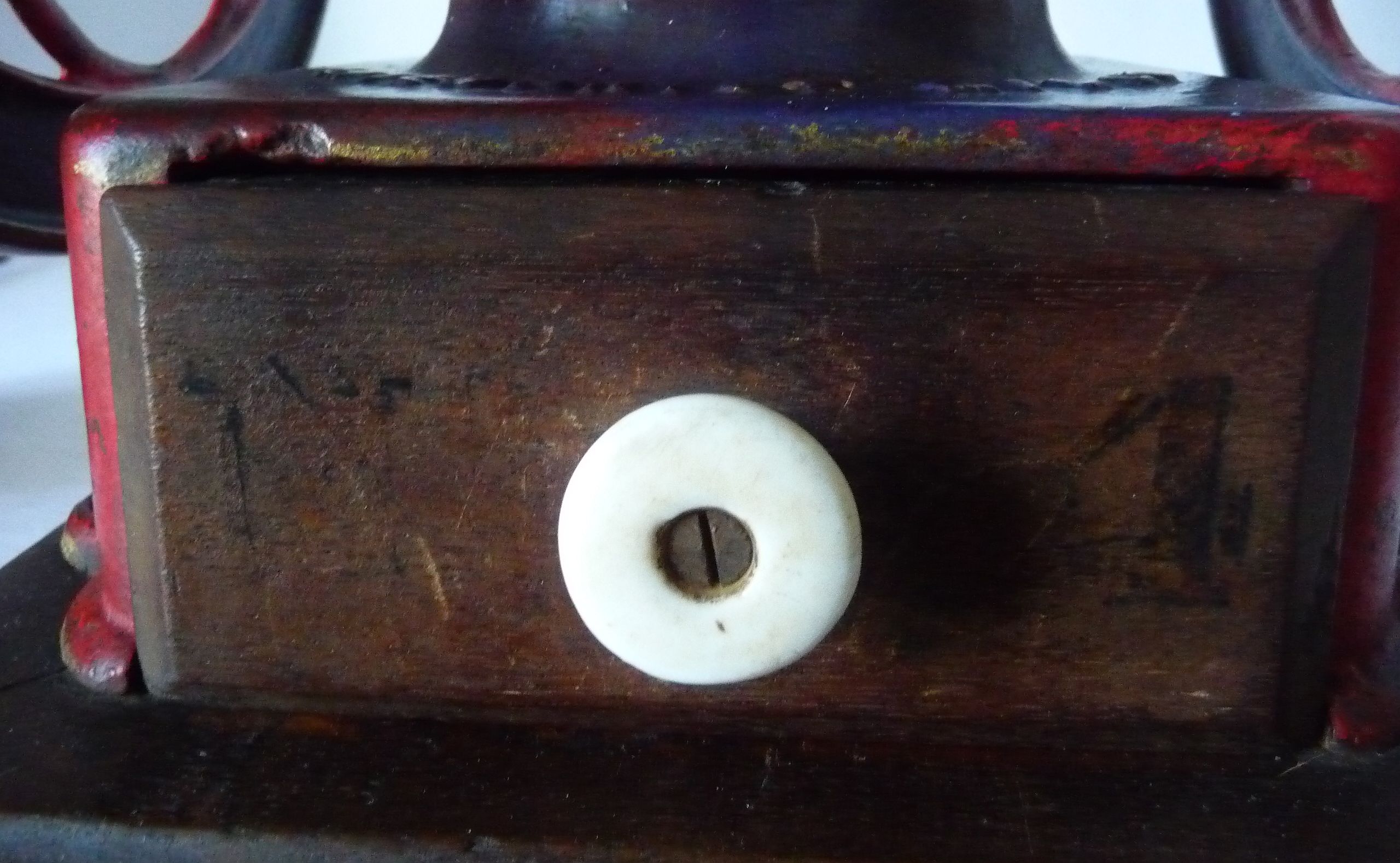 Condition: The mill itself is all original, wear as expected from age and use. Lid and hinge may have been restored many years ago with a correct lid for the mill. All else is original, no damage, no repairs or repaint.