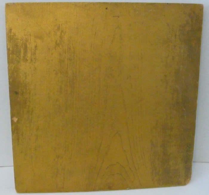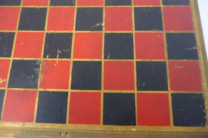 Square 19th century gameboard made from a single board. Painted alternating red and black squares with gold outline. Framed in gold.