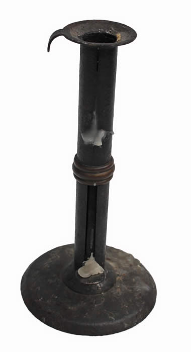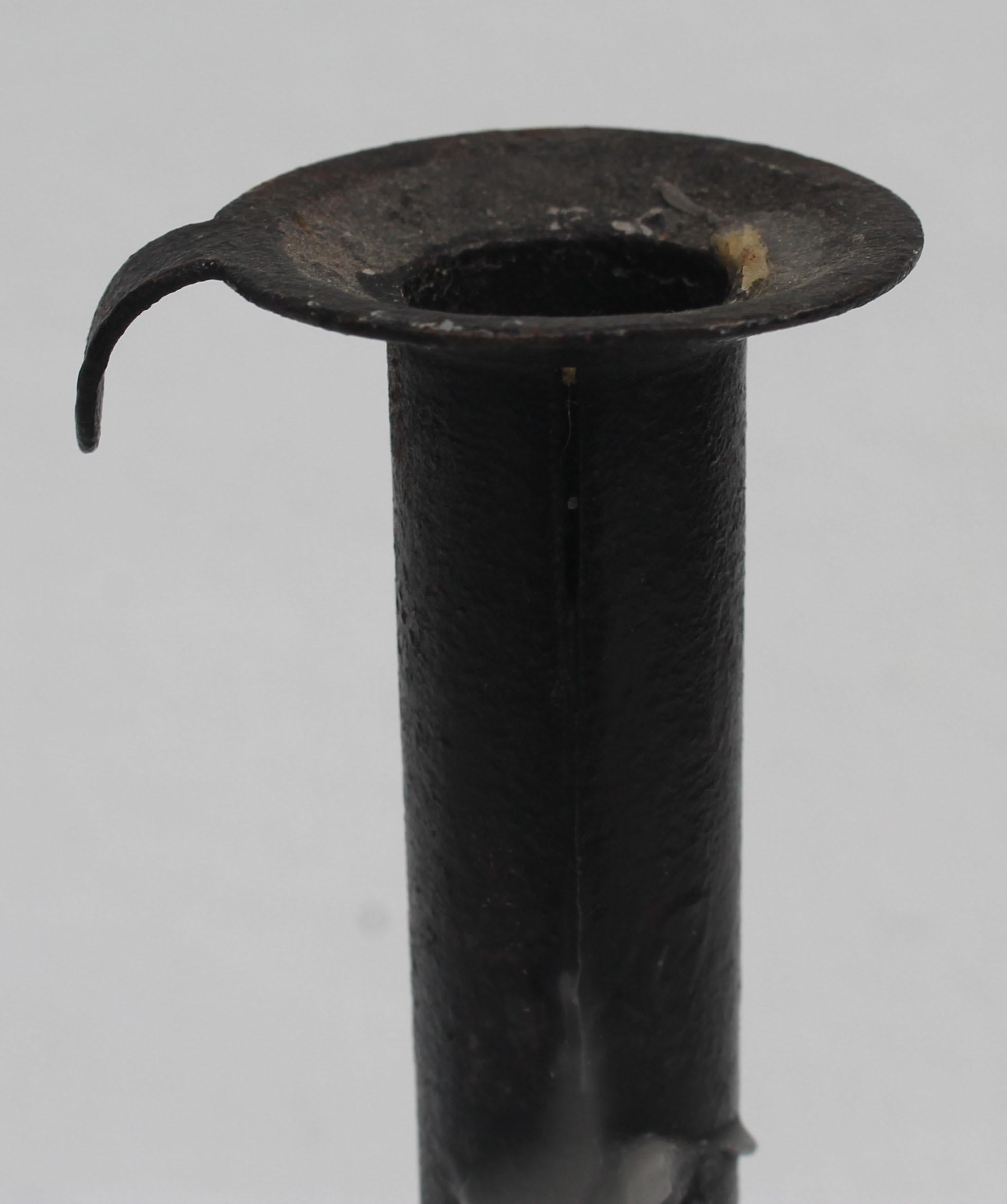 Late 18th Early 19th Century England Sheet Iron Hogscraper Candlestick with Brass Wedding Band