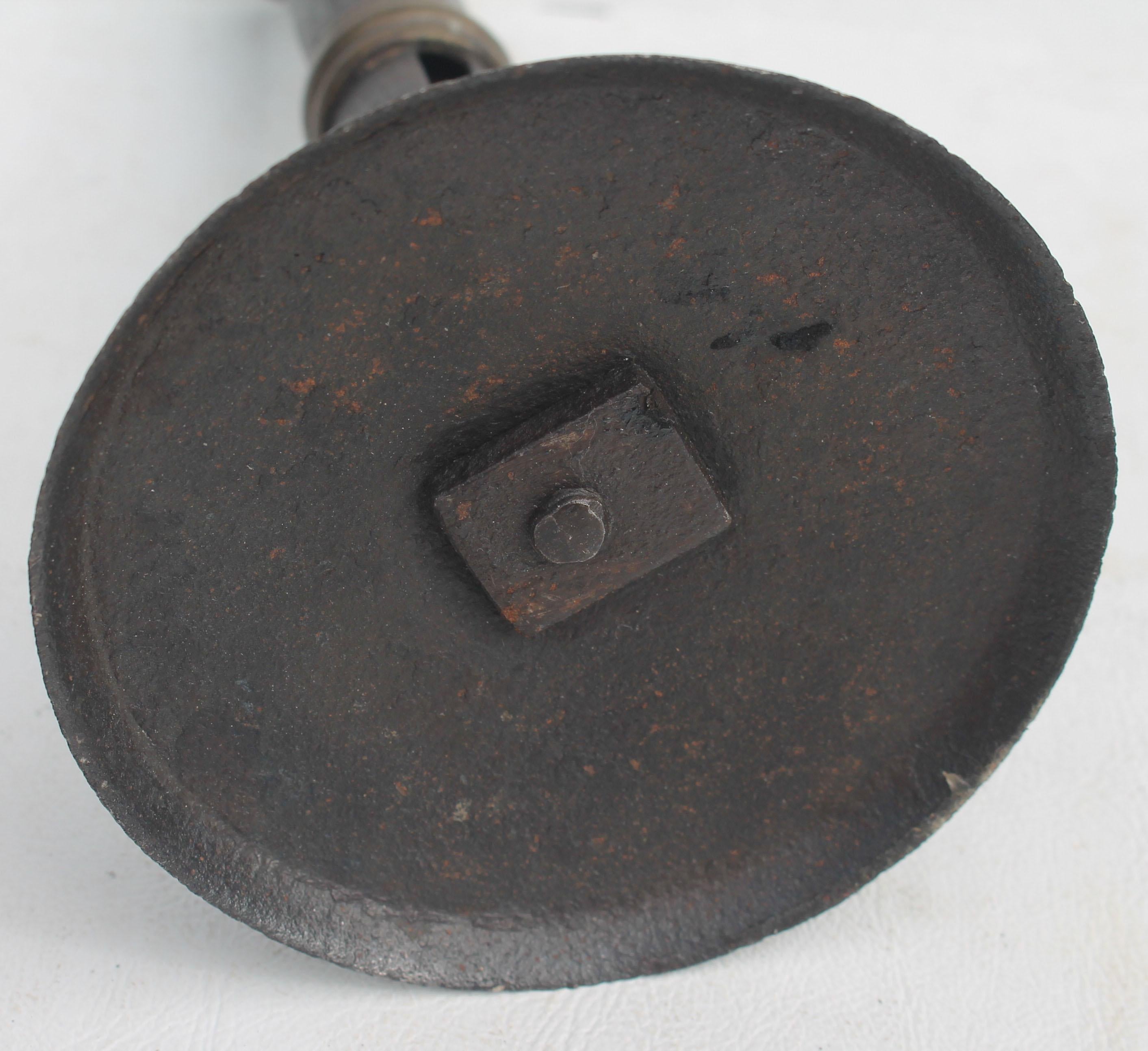Condition: As found, no damage or repairs. This iron candlestick retains its original hanging hook on the lip and the thumbscrew/ejector mechanism.