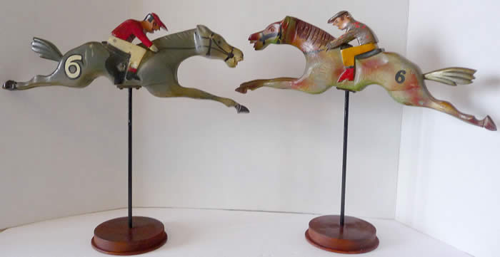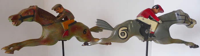 Pine, original paint, well carved figures of two horses with riders in full racing pose. Probably from a carnival game. Mounted on to later wooden bases. 2nd Quarter 20th C.
