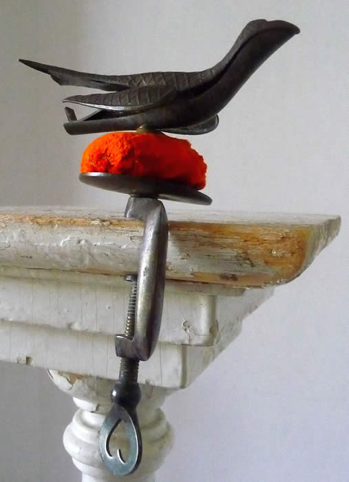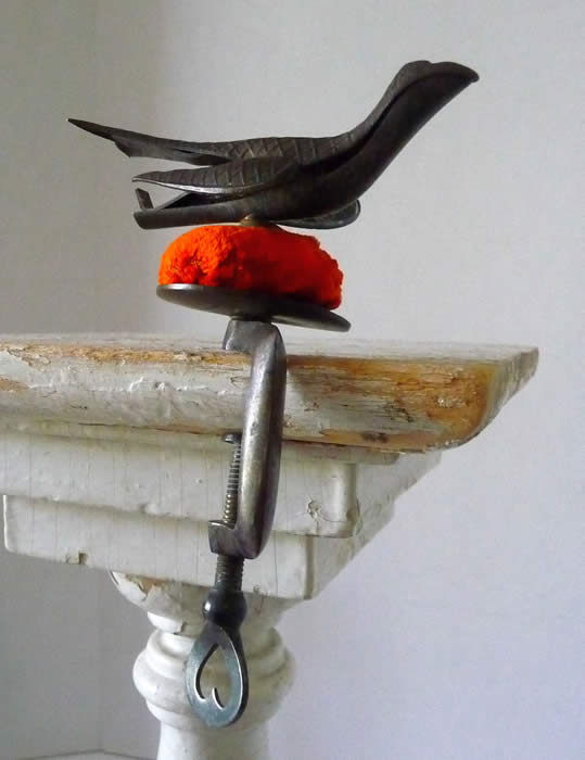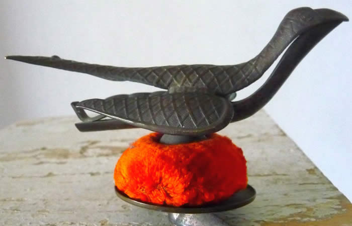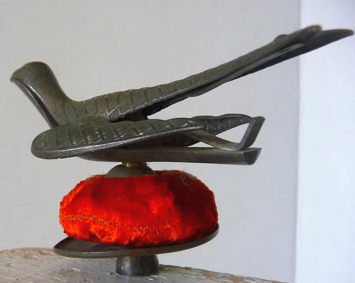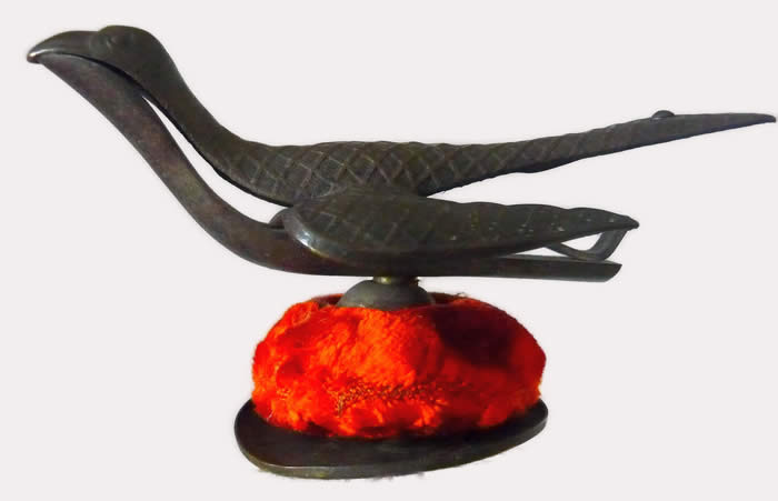 The top is cross hatched brass. It was clamped to the table while sewing (note the heart thumbscrew). It has a strong spring under the tail of the bird. When you squeeze the bird's tail, its mouth opens to receive the fabric being sewn and hold it in its mouth. It was so useful to the seamstress; it was often referred to as a 'third hand'.