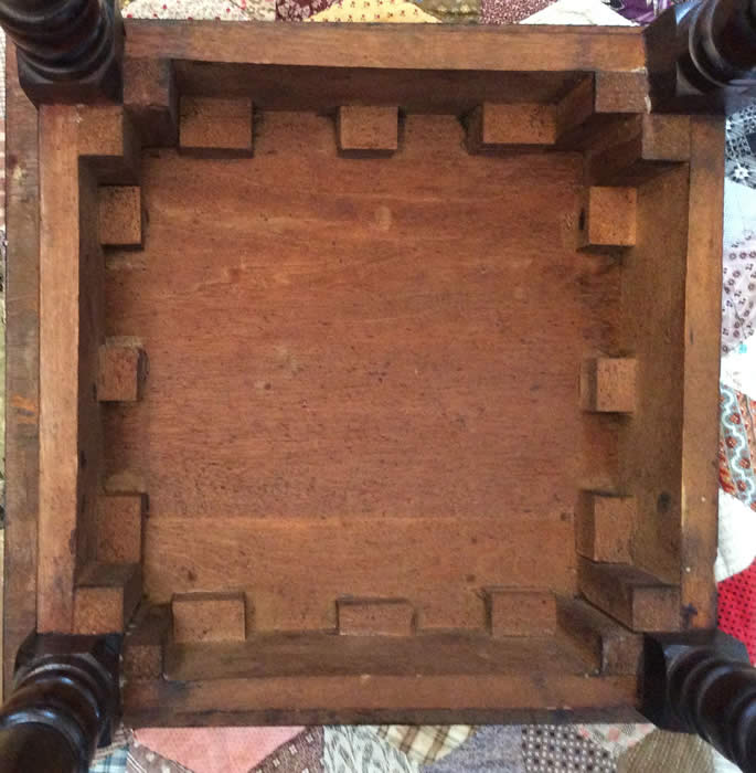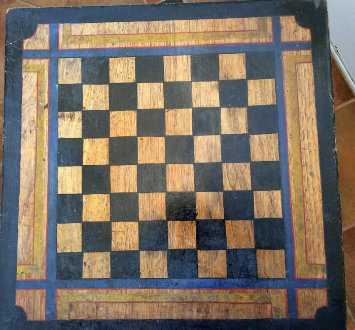 The square top is painted with black checkerboard squares surrounded by blue, black, and red and yellow borders. The skirt is straight, joining ring-turned tapering legs. There are no drawers.