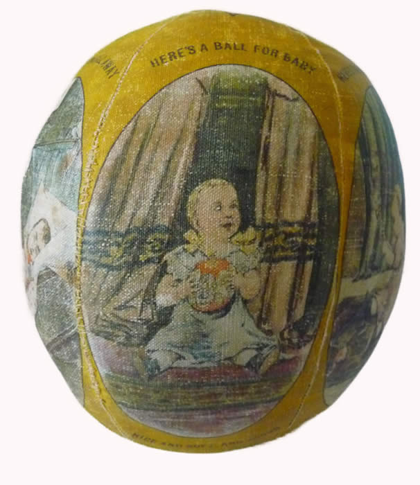 Stuffed textile ball with 6 lithographed illustrations from a nursery rhyme. Each wedge shaped segment of the ball is chromolithographed with scenes of a baby engaged in various activities typical of a Victorian child. Each illustration is accompanied by 2 descriptive lines of verse one above and one below. “Here’s a ball for baby/ nice and soft and round / here’s the baby’s hammer/hear the baby pound / here’s the baby’s soldiers/standing in a row / here’s the baby’s trumpet/hear the baby blow / don’t take the ball away/ to make baby cry / here’s the baby’s cradle/to rock baby by”