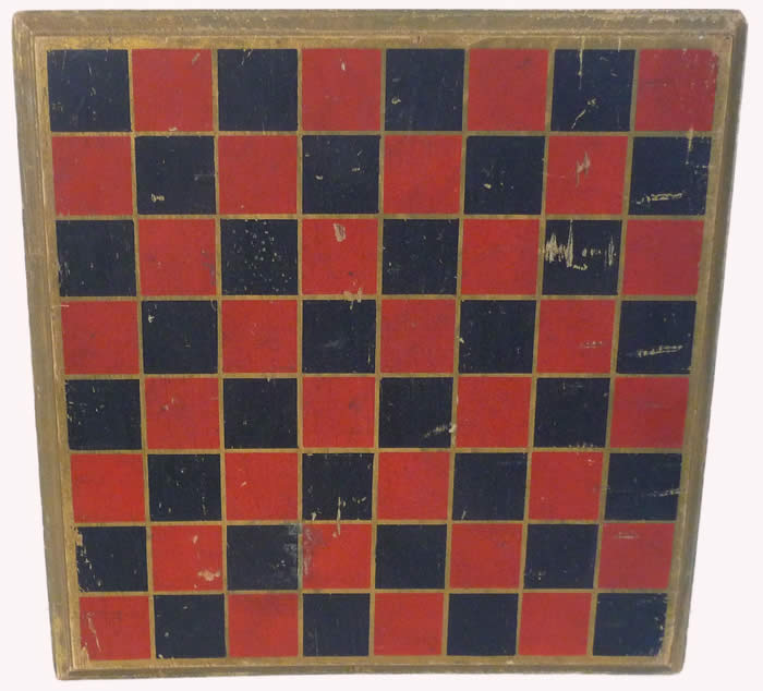 Square 19th century gameboard made from a single board. Painted alternating red and black squares with gold outline. Framed in gold.