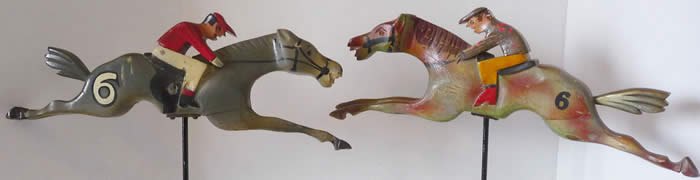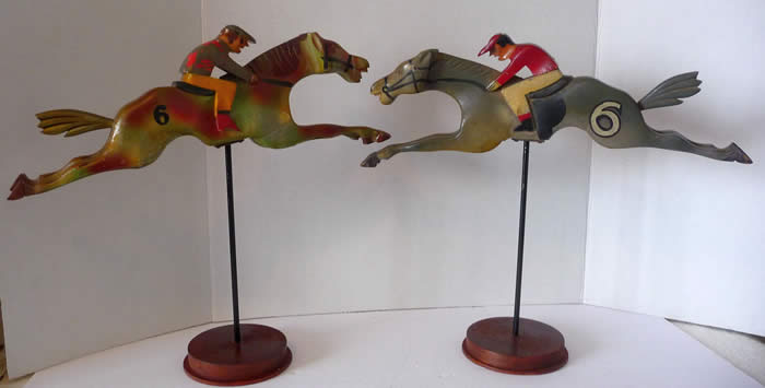 Pine, original paint, well carved figures of two horses with riders in full racing pose. Probably from a carnival game. Mounted on to later wooden bases. 2nd Quarter 20th C.